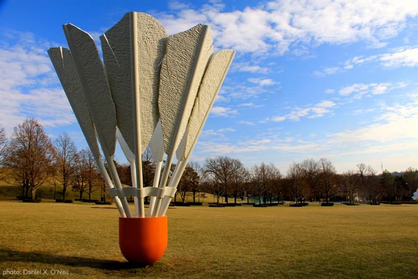 The lawn of the Nelson-Atkins Museum of Art is home to four, 18 foot-tall badminton shuttlecocks. The gigantic aluminum and fiberglass pieces were created by the husband-and-wife team of Claes Oldenburg and Coosje Van Bruggen.