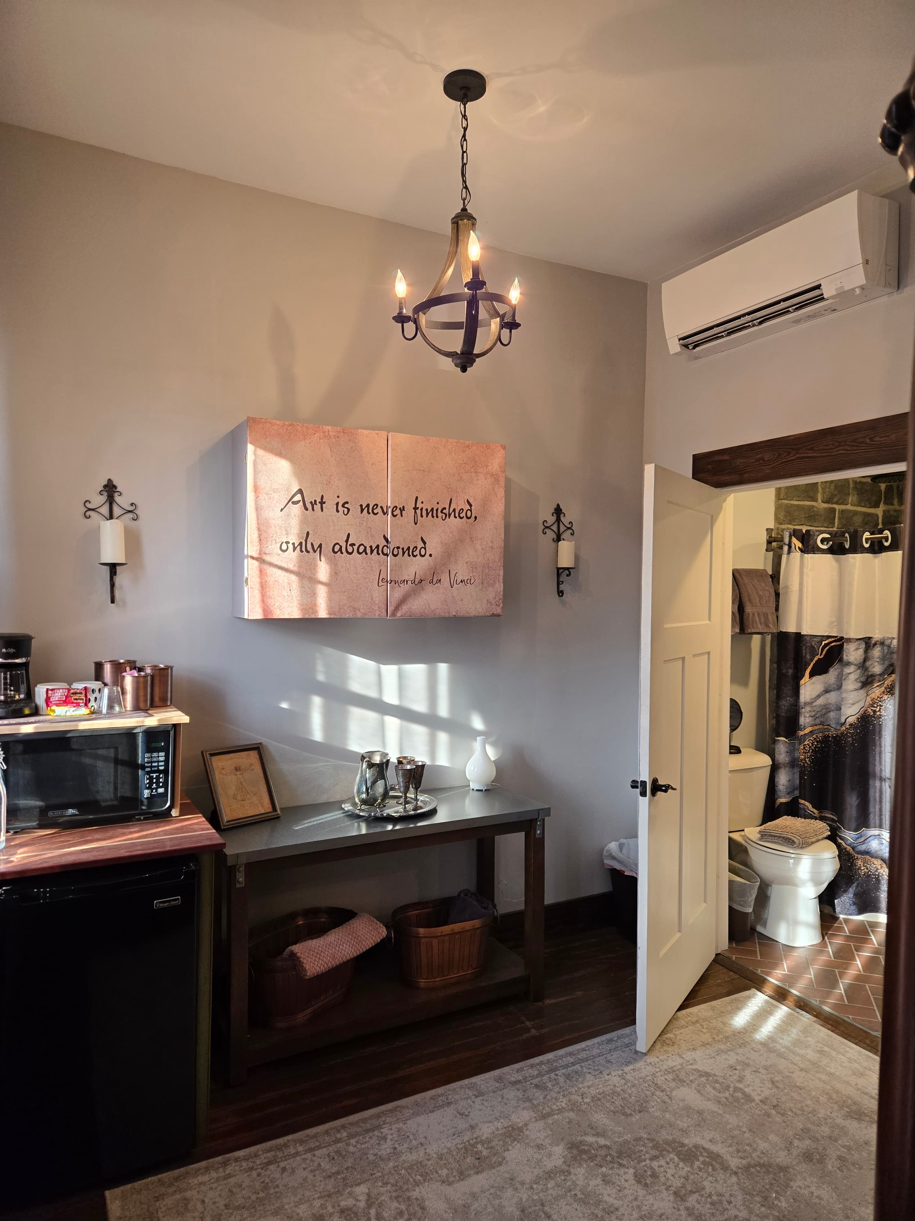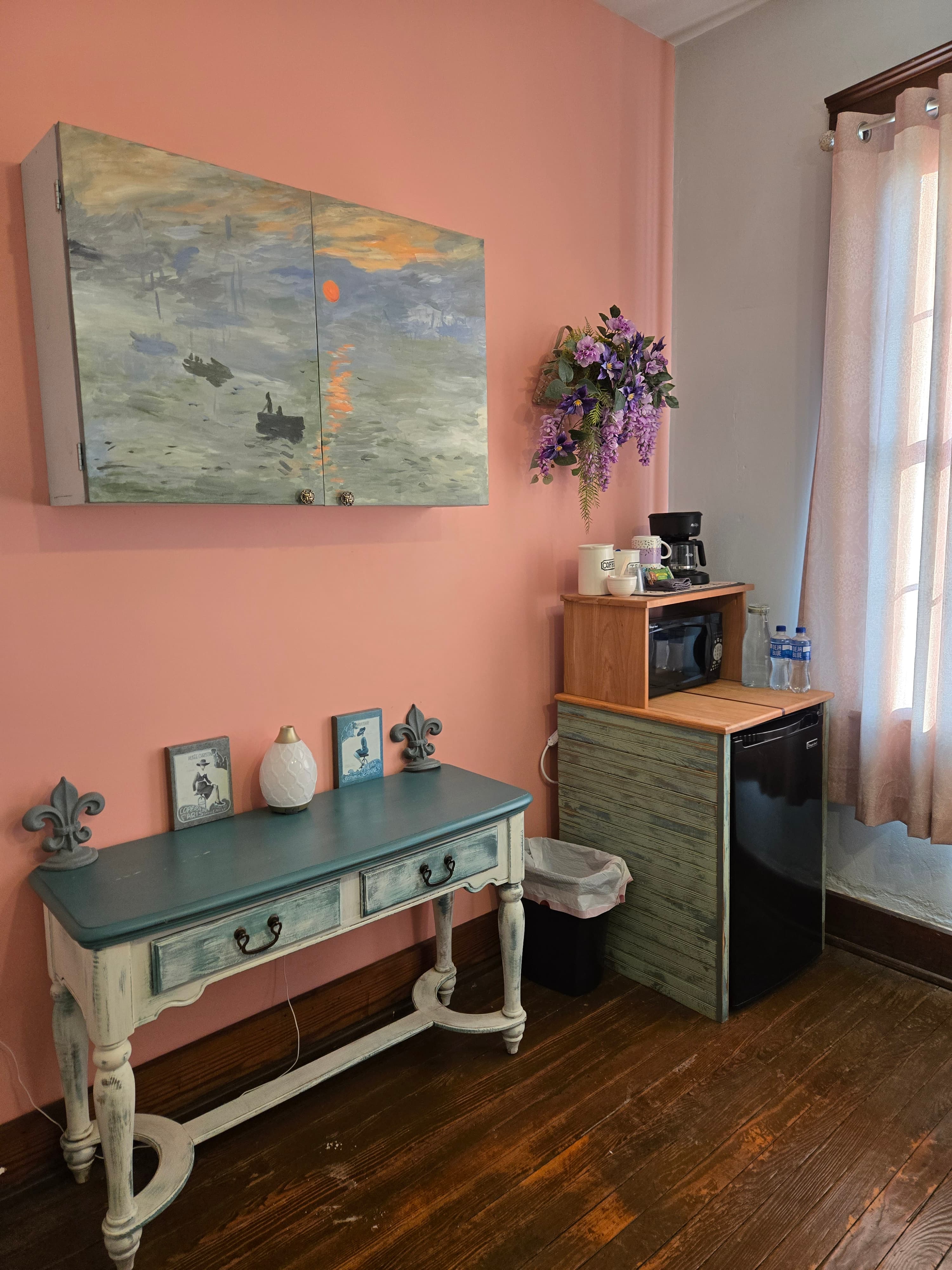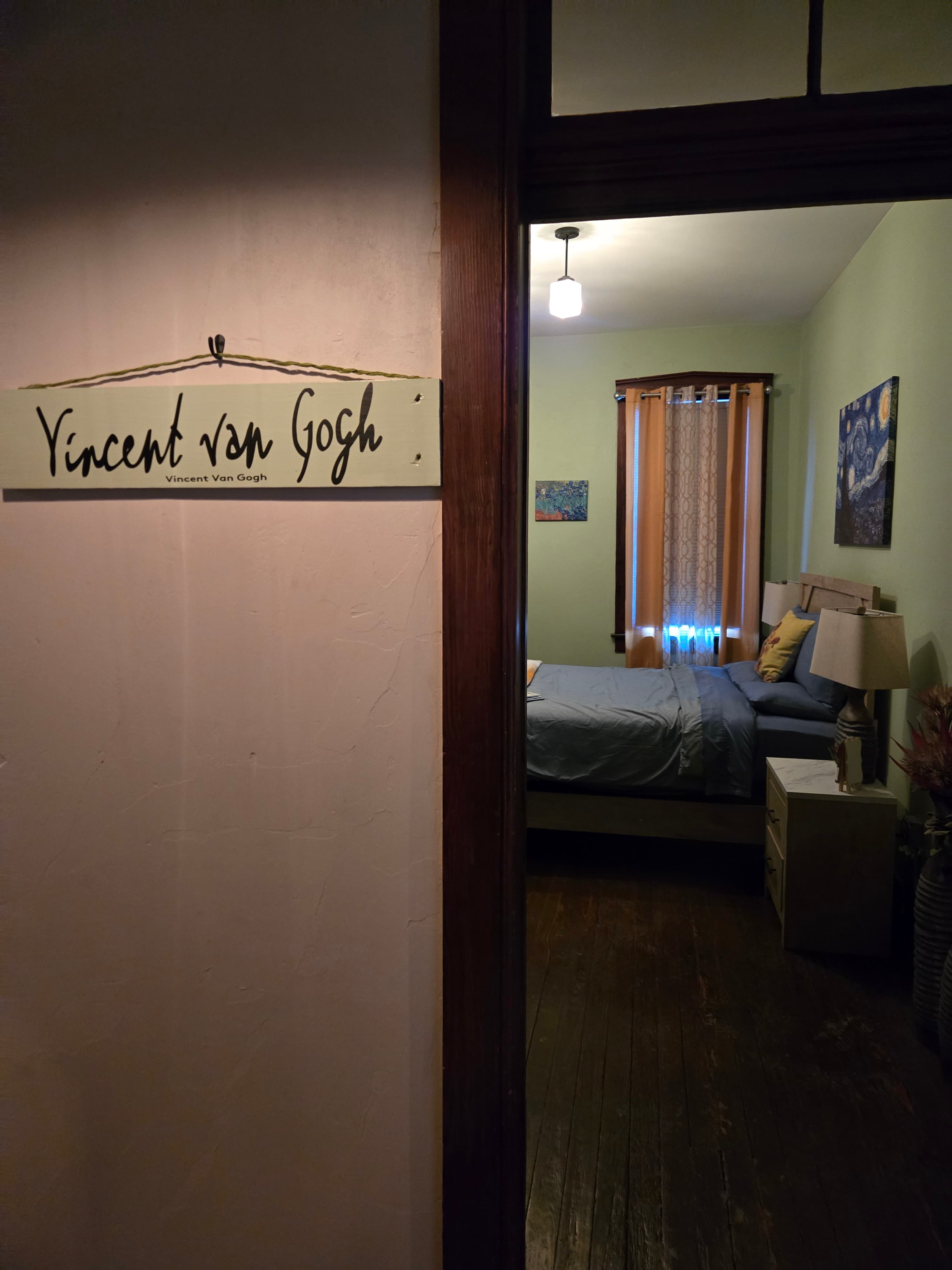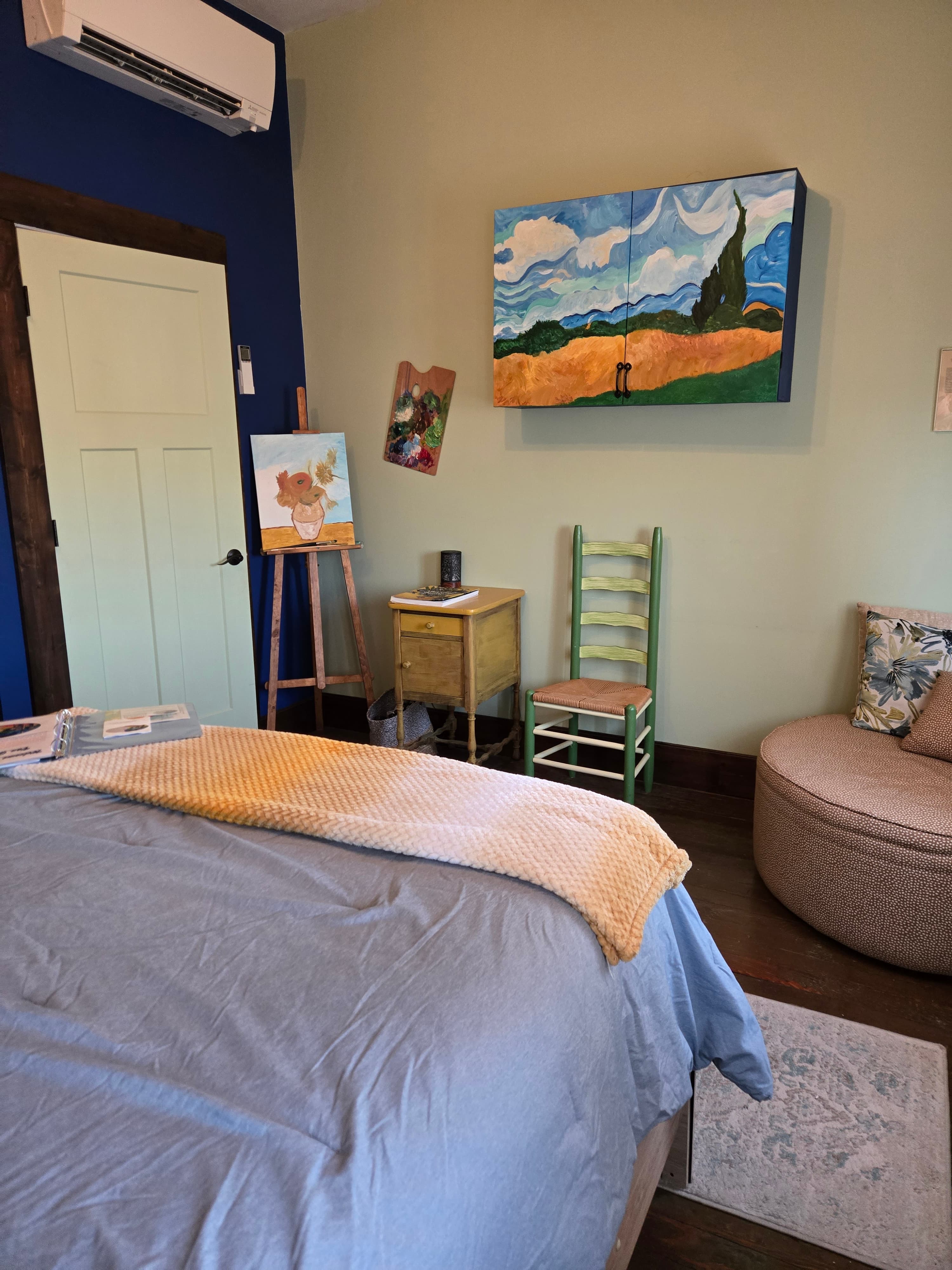 Welcome to our enchanting Artist Suites, where art and accommodation seamlessly blend. Our unique space boasts four distinct rooms, each is a work of art in itself, designed to provide you with a one of a kind immersive stay that celebrates the genius of these renowned artists. All four rooms are rented individually, with modern amenities such as private small bathroom, a mini frige, microwave, and coffee pot. The suites are self check-in, with one on site parking space, and a wonderful open aired deck and patio for all guests to enjoy.