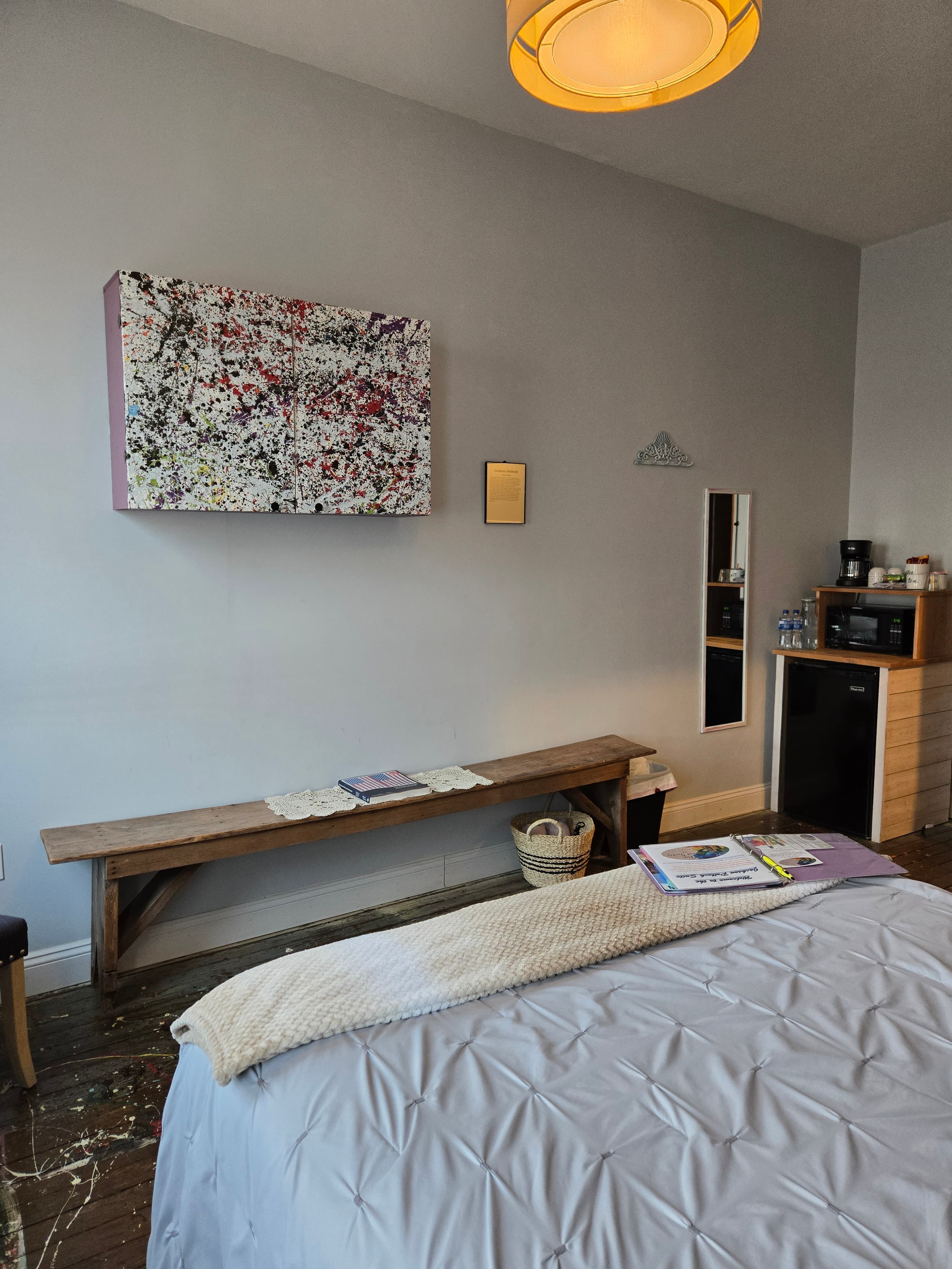 In the Pollock room, vibrant splatters and expressive colors adorn the walls, offering a lively and energetic atmosphere that pays homage to Jackson Pollock’s iconic abstract expressionism. *Queen size bed, accommodates 2, with private bath.
